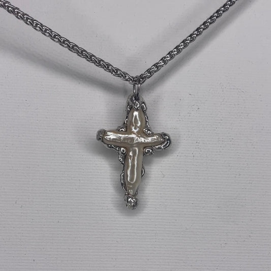 The Soldered Cross Pendant is the centerpiece of our current collection. Hand-soldered, featuring freshwater pearls, and unapologetically bold – it’s the perfect addition to your Y2K jewelry collection. Whether layered over a sleek tank top or styled with a mesh tee, it gives your look that effortlessly cool, grunge-meets-glam energy.