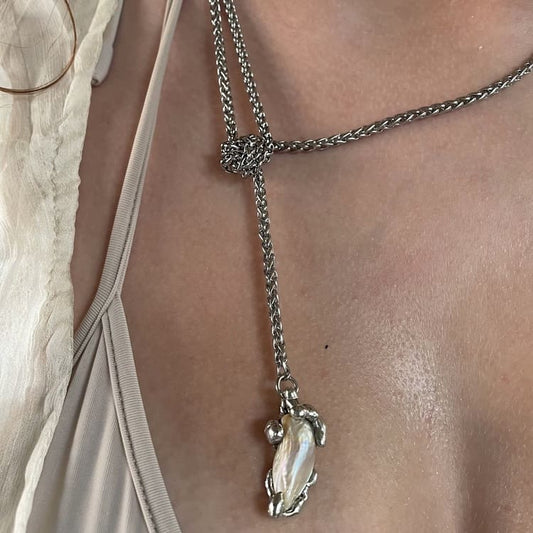 asymmetrical, knotted necklace + freshwaterpearl pendant